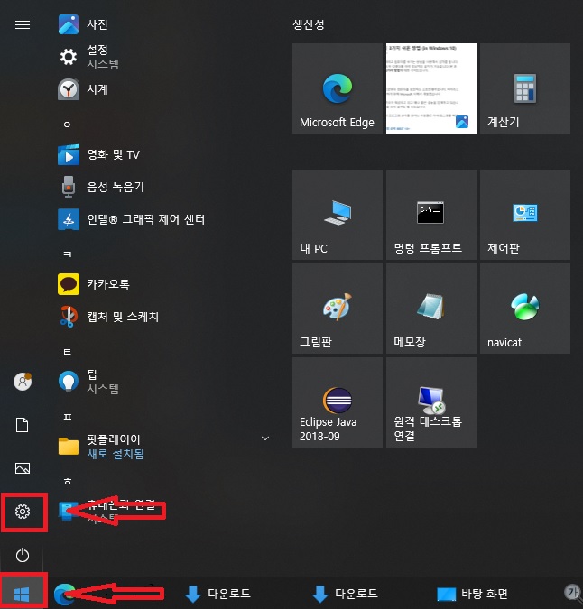 ① 윈도우 바탕하면 좌측 하단의 윈도우 로고를 클릭한 후, 설정(톱니바퀴 아이콘) 버튼을 클릭하면 윈도우 설정 창이 열립니다. 또는 ‘윈도우 로고 + I’ 버튼을 클릭하여 윈도우 설정 창을 열어줍니다.
