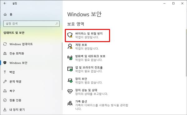 ③ 창이 열리면 ‘Windows 보안’을 클릭한 후, 우측 ‘바이러스 및 위협 방지’를 클릭합니다.