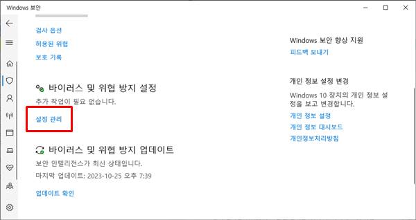 ④ 바이러스 및 위협 방지’ 창이 뜨면 ‘바이러스 및 위협 방지 설정’ 아래에 있는 ‘설정 관리’를 클릭합니다.