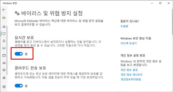 ⑤ 실시간 보호를 [켬] 에서 [끔]으로 변경하시면 실시간 보호기능이 해제됩니다.