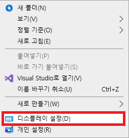 ① 컴퓨터의 바탕화면에 오른쪽 마우스 누른후 디스플레이 설정을 클릭 합니다.
