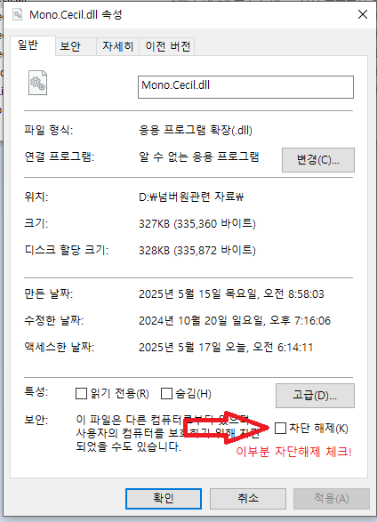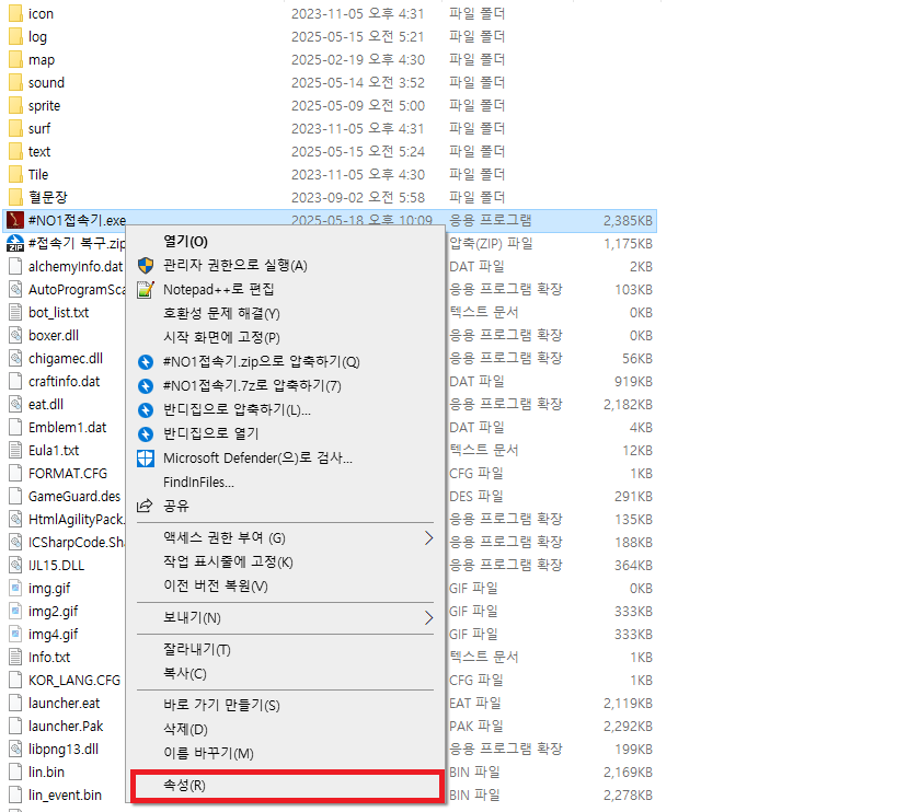 ② 해당 파일 2개다 각자 오른쪽 마우스를 눌러서 속성을 클릭 합니다.